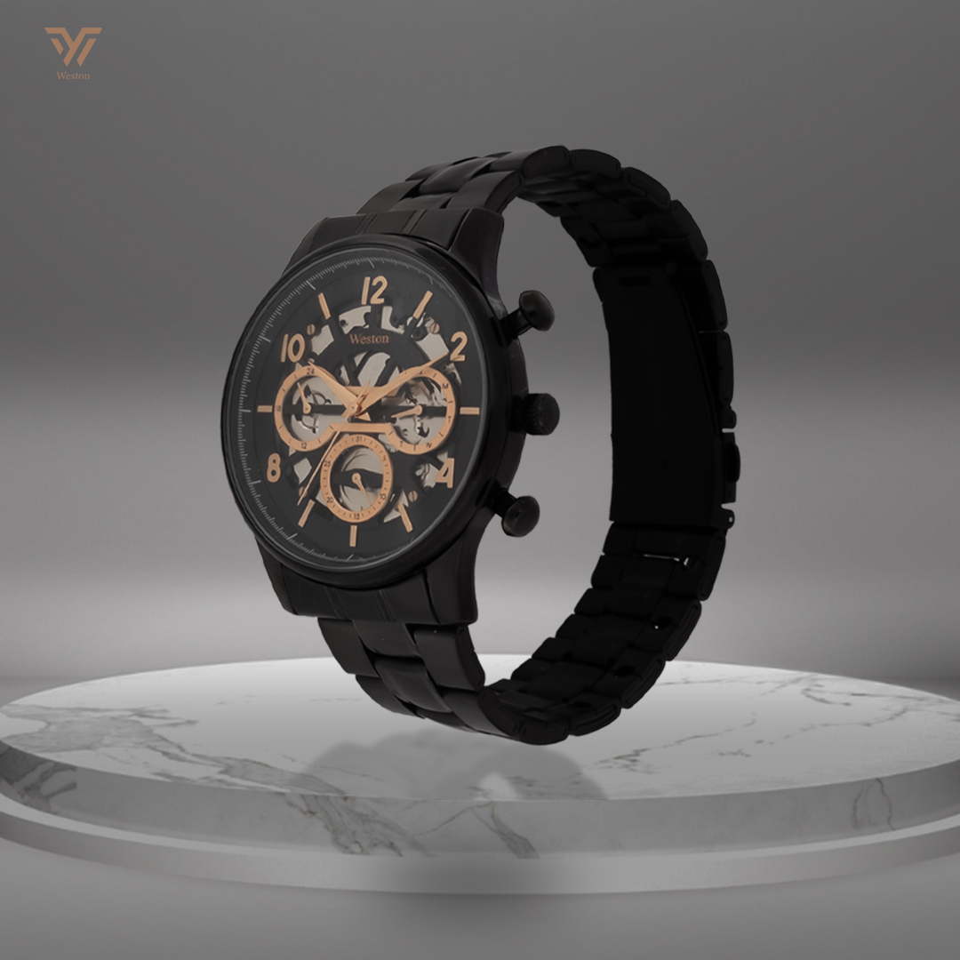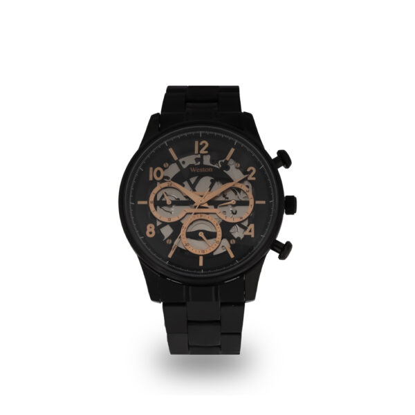 Experience the intricate beauty of mechanical watchmaking with the Weston Cronos. This timepiece showcases a captivating skeleton dial that reveals the inner workings of the self-winding movement. The black dial with rose gold accents and chronograph sub dials creates a striking contrast against the black stainless steel case and bracelet.