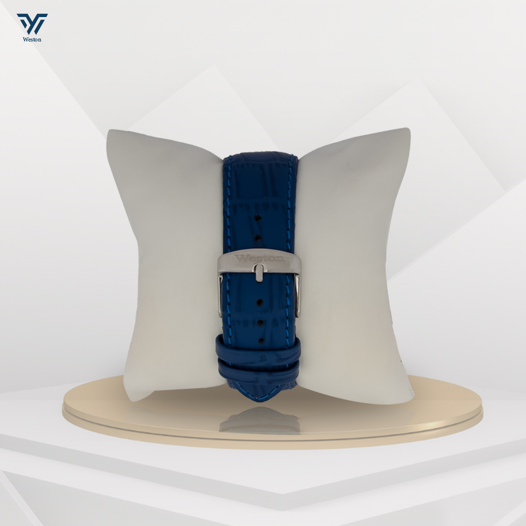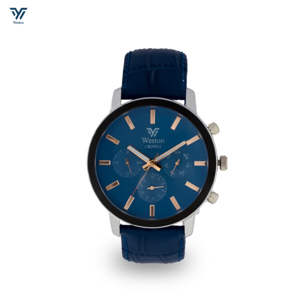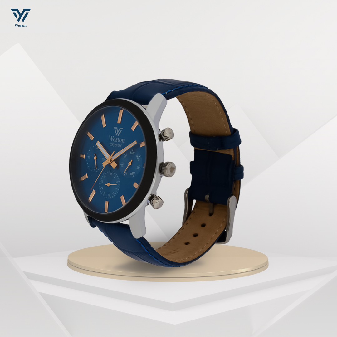 This Weston Cronos Series is a perfect blend of classic style and modern functionality. The sleek blue dial with rose gold accents and chronograph sub dials creates a striking contrast against the silver-toned stainless steel case and blue leather strap.