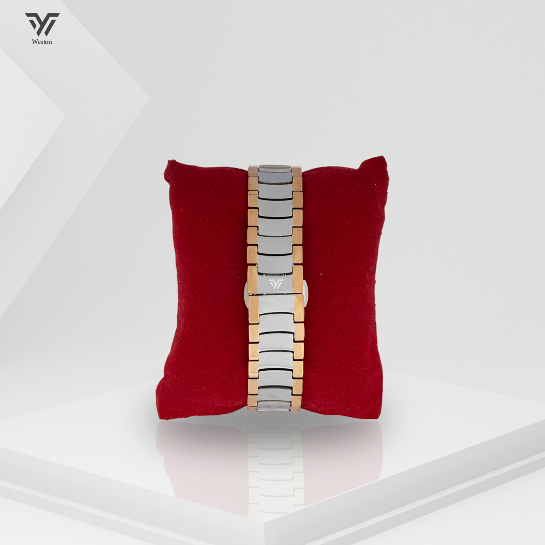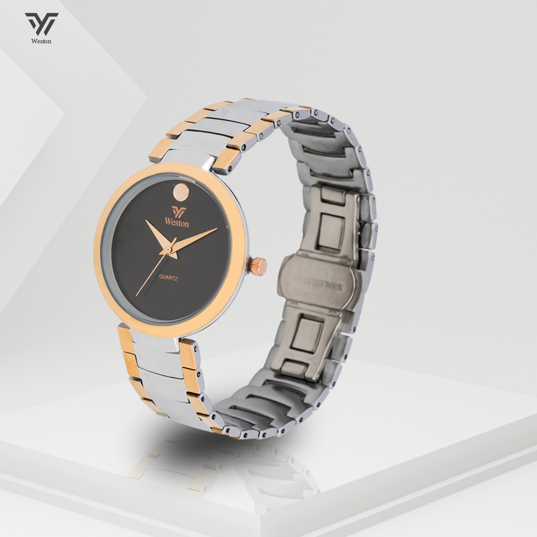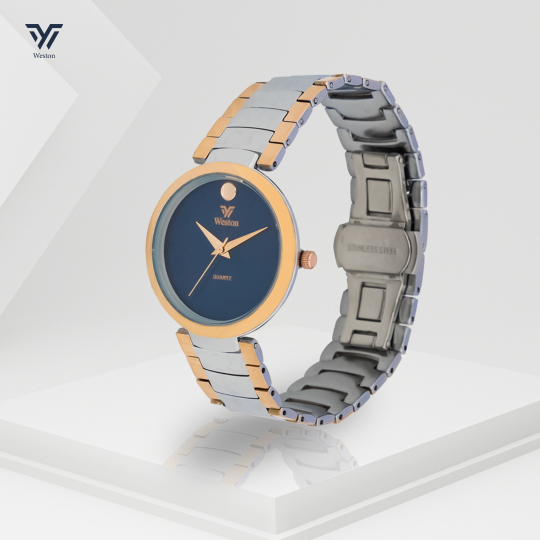 This Weston Quartz watch is a perfect blend of classic style and modern functionality. The sleek black/navy/white dial with gold-tone accents and a moon phase indicator creates a striking contrast against the two-tone stainless steel bracelet.